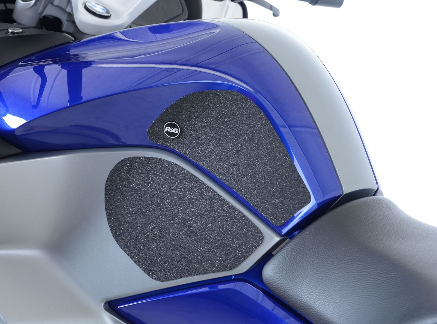 R&G Tank Traction Grip kits are available for many different bike styles and brands, with new applications released regularly. The unique R&G Tank Traction Grip texture was specifically designed to be both soft and durable, providing the rider with the grip and feel he/she needs to assist in better bike control, enabling the rider to maintain a stable body position while cornering and braking, whilst also relieving fatigue and providing the rider with complete confidence allowing him/her to fully focus on the road (or track) ahead instead of slipping and sliding on the tank.Each Tank Traction Grip kit is supplied with precision pre-cut adhesive pieces, designed to fit the intended bike, typically in either 2, 4 or 6 pieces (in total) depending on the shape of the tank and adjoining fairing. The high-strength adhesive backing ensures a highly durable product that will stay exactly where you put it, as well as not affecting or damaging paintwork. Each R&G Tank Traction Grip kit is available in black and ultra-clear finishes to blend into your bike’s paintwork or stand out, depending on your preference. R&G Eazi-Grip™ works in both wet and dry conditions and is equally at home on the track as it is on the commute home!Please note: R&G Tank Traction Grips now come with a 25mm diameter stick on emblem. This Tank Traction Grip has been specially designed for the BMW R1200RT '14- & R1250RT '19-. Made in the UK.