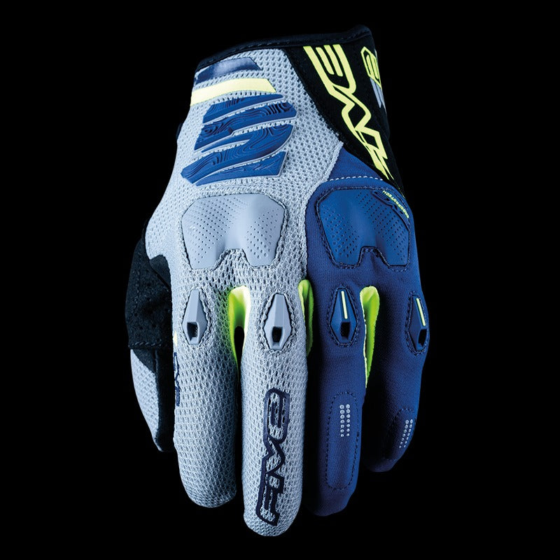 THE GLOVES SPECIFICALLY DESIGNED FOR RECREATIONAL AND COMPETITIVE ENDURO. CE CERTIFIED! We proudly present the result of our collaboration with five-time Enduro World Champion Steve Holcombe, and 2019 E2 World Champion Lo-c Larrieu, after many months in development: the E2, a glove designed specifically for Enduro, both recreational and competitive. It offers all the performance of a motocross glove, combined with a superior level of protection that s essential in the great outdoors. This includes branches and rocks that can sometimes be tough on riders because you re not always protected by handguards, particularly if you take a spill. So, we ve included just the amount of reinforcements and protection you need at strategic points, so you maintain total freedom of movement. This is what we re talking about with the dual-shell ERGO PROTECH- in soft TPR, which ll protect you from tree trunks or rocks, but is also nearly undetectable when you re at the controls. We ve really focused on ventilation, with mesh fabric on the inner half of the hand, while we ve kept the tougher materials on the outer half that s more exposed to all kinds of contact (with trees, thorns, rocks, etc.). And since Enduro means you spend long hours at the controls, navigational contact has to be comfortable. The E2 is thus equipped with a palm in AX Suede- Novobuck , a material that provides excellent grip and is both durable and comfortable, along with 2 mm foam rubber pads on the palms and 3 mm on the thumbs. You get the picture: with the E2, FIVE offers an Enduro-specific glove that s bound to set the standard TECHNICAL FEATURES Topside: Mixed construction, with ventilated mesh on the inner side/ extra-tough 4-way-stretch polyester on the outside / Palm: AX Suede- Novobuck / hypothenar and control contact-point reinforcement in synthetic leather / 2 mm foam rubber reinforcements on the palms / 3 mm foam rubber padson the thumbs Dual ERGO PROTECH- protective shells in soft TPR, virtually undetectable Mini-protective shells in TPR on the fingers + 3 mm foam rubber reinforcements on the ring and little fingers 5 TPR Sonic heat-sealed protective logo FIVE ErgoFit construction for optimal fit and freedom of movement Synthetic leather reinforcement on the edge of the hand, up to the radius Silicone print on the inside of the fingers for optimal grip Clear Vision Pad visor cleaning system on the left-hand side Touch Screen system (index finger) for handling electronic devices Adjustable tab closure integrated into the mesh and Velcro- fabric structure of the glove