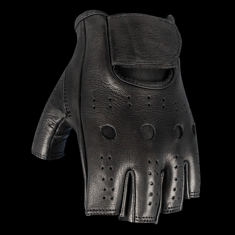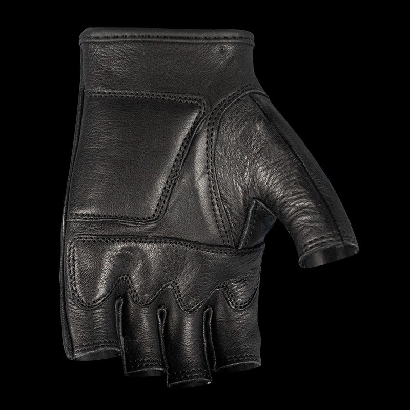(SUMMER) Popular fingerless design for warmer climates. Genuine cowhide leather Palm patch reinforced Vented knuckles Velcro cuff strap