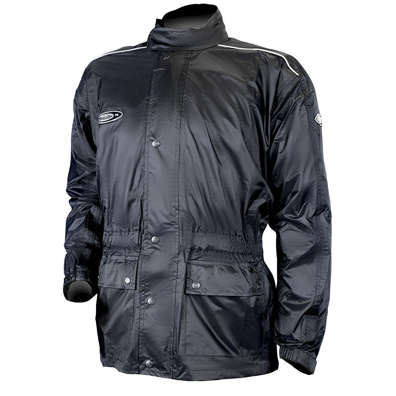(RAINWEAR) A durable nylon/pvc backed rainwear jacket, double row stitched for extra strength and durability, all seams carefully tape sealed to ensure 100% waterproof.