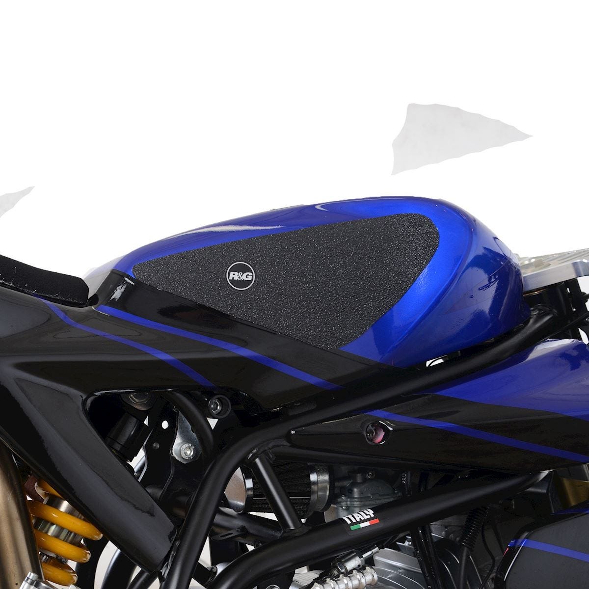 R&G Tank Traction Grip kits are available for many different bike styles and brands, with new applications released regularly. The unique R&G Tank Traction Grip texture was specifically designed to be both soft and durable, providing the rider with the grip and feel he/she needs to assist in better bike control, enabling the rider to maintain a stable body position while cornering and braking, whilst also relieving fatigue and providing the rider with complete confidence allowing him/her to fully focus on the road (or track) ahead instead of slipping and sliding on the tank. Each Tank Traction Grip kit is supplied with precision pre-cut adhesive pieces, designed to fit the intended bike, typically in either 2, 4 or 6 pieces (in total) depending on the shape of the tank and adjoining fairing. The high-strength adhesive backing ensures a highly durable product that will stay exactly where you put it, as well as not affecting or damaging the paintwork. Each R&G Tank Traction Grip kit is available in black and ultra-clear finishes to blend into your bike’s paintwork or stand out, depending on your preference. R&G Tank Traction Grips work in both wet and dry conditions and is equally at home on the track as it is on the commute home! Please note: R&G Tank Traction Grips now come with a 25mm diameter stick on emblem. This 2 piece R&G Tank Traction Grip kit has been specially designed for the Ohvale 110/160. Made in the UK.