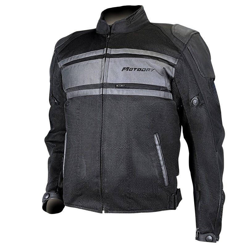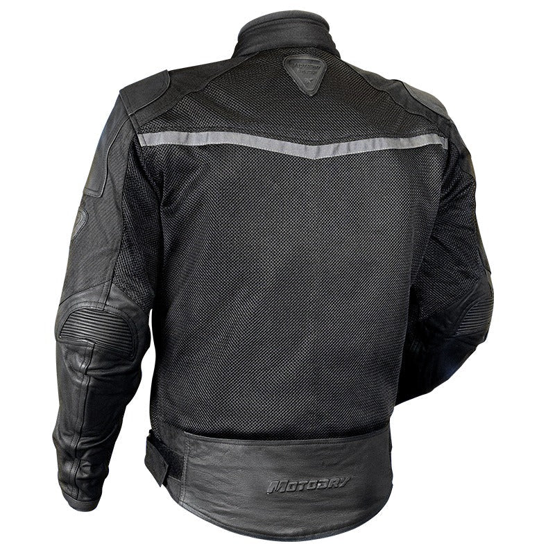 (SUMMER MESH) - Combination Leather / Mesh / Textile Construction - 600D H/Duty Abrasion Resistant Material Active Air Power-Mesh Panels - Genuine Leather Reinforced Shoulder / Elbows & 1000D Reinforcement - Zip out W/Proof Lining - Zippered Top Pocket - Provision for Clip In Optional Thermal Lining - Safety CE Shoulders/Elbows Protection & HDF Back Protector (Removable) - Soft Feel Collar - Zip/Snap Cuff Closure - Ribbed Elbow for Extra Comfort - Long Padded - Genuine Leather Kidney Panel - Genuine YKK Zips - Night Safety Reflective - Adjustable Arm Straps / Waist - Large Water Resistant Lower Pockets