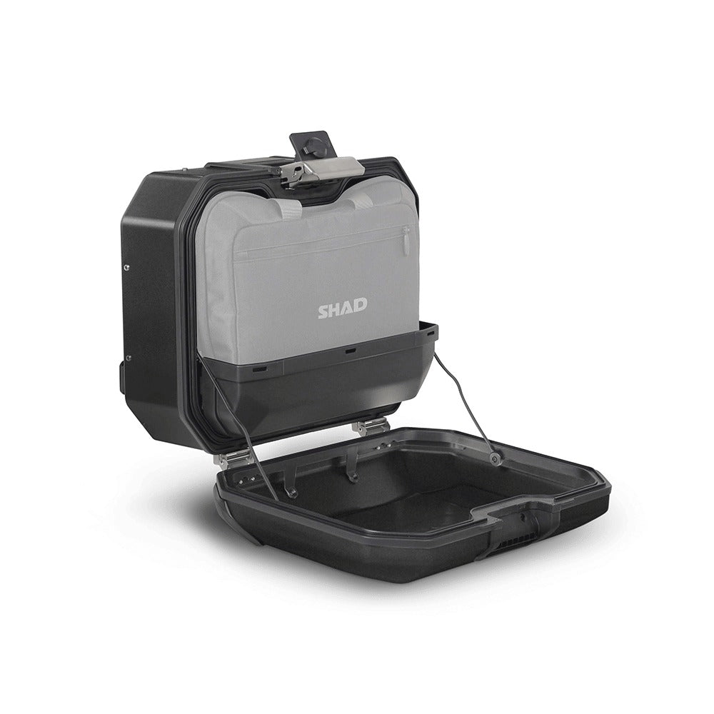The TR36R side case is designed, engineered and made 100% in Barcelona. Made from hardened aluminium alloy, a stronger and lighter type of aluminium which allows a reduced cross section of 1.2mm to obtain a minimum weight with maximum resistance. The TERRA BLACK EDITION is finished with scratch resistant powder coated paint. AISI 304 stainless steel hinges and pegs so you can set the case on the ground without it rolling over, and ABS case guards to protect from impacts. Includes the patented (pending) TERRA Lock System . With an AISI 304 industrial grade stainless steel structure and includes mechanism and a retractable carrying handle. The key innovation is the incorporation of the integrated mechanism and handle in the main structure of the case, which creates a clean surface designed to increase security, the mechanism also improves ergonomics while carrying the cases off of the bike. This patented mechanism and handle is multifunction: It allows to open, remove and transport the case. The keys and lock cylinder of the TR36 are the new premium version from SHAD, with a system that reduces the chance of theft. And a cover that stops dust from entering. Protection for your gear from adverse weather conditions thanks to the Water resistance of the case. Side opening: perfect for packing , with large capacity and space, and an internal tray that allows you to hold your belongings, keep them tidy and prevent them from falling out when you open the suitcase. The TR36R also includes an internal mesh net that maximizes the hold of the load inside. The Terra side cases are designed to be attached to the motorcycle through the new 4P System. It is a stainless-steel structure covered with high hardness metallic paint. Thanks to its 20mm diameter, the thickest on the market, it provides maximum strength and resistance and is also reinforced with a crossbar for the most extreme rides. The TR36R includes 3 lock cylinders and 2 keys so you can unify the locks on the 3 cases (Sides and top). The lock cylinders are easy changeable; in less than 5 minutes you can unify the top & side cases for use with one key. Third cylinder included for the top case in the right-side case. Accessories (not included): Expandable inner bag (LSL-X0IB47).
