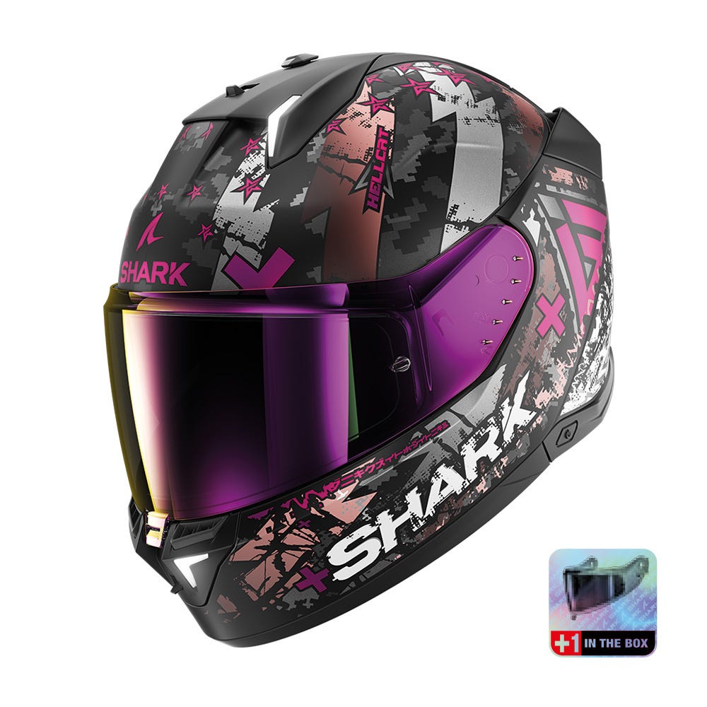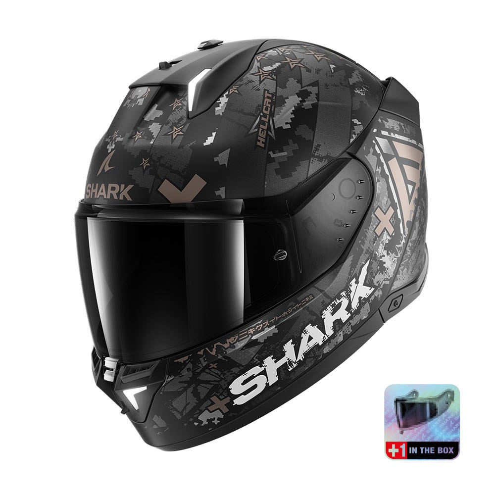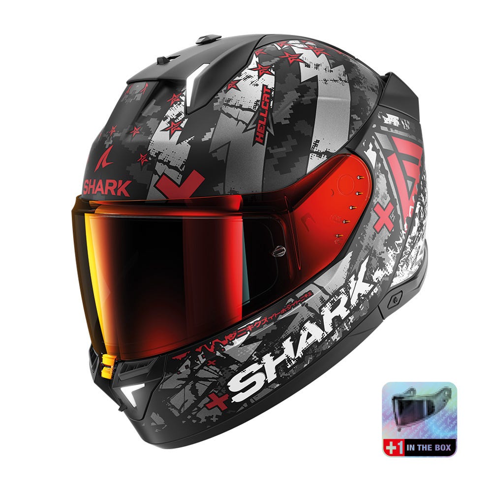 WORLD’S FIRST HELMET WITH INTEGRATED BRAKE LIGHTS! Type of helmet:Full-face helmet with integrated LEDs Type of use:Roadster LED LIGHTS & ACTIVE BRAKE LIGHTS AS STANDARDThis innovative safety led system, tried and tested since the first version of the skwal, has been redesigned with the addition of active brake lights as standard. Thanks to the integration of a triaxial accelerometer, you enjoy the benefit of smart brake lights on your helmet without the need for cables or bluetooth! STRUCTURE AND SAFETY: NEW UN ECE 22-06 Certification NEW Shell made of high-impact LEXAN™ injected polycarbonate 2 shell sizes for optimal morphological adjustment Micrometric adjustment buckle Multi-density EPS padding Integrated battery rechargeable LED lights including active brake lights using a triaxial accelerometer. VISOR: NEW Highly resistant, Optical Class 1, anti-scratch visor with Pinlock® NEW Patented rapid, no-tool visor removal system NEW Anti-scratch & anti-fog sun visor NEW Visor locking system with air inlet position NEW Pinlock® tension adjustment pins INSIDE: “BEST FIT” by SHARK: 3D scan an array of users to define best possible fit Removable interior suitable for machine washing (30°C max) EasyFit system: Optimal comfort for riders wearing glasses Slot reserved for the Sharktooth® intercom AERODYNAMICS AND VENTILATION: Aerodynamics optimized by means of CFD (Computational Fluid Dynamics) design studies 2 air inlets 2 air extractors