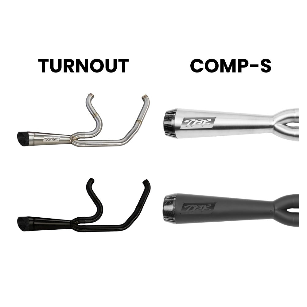 NOTE: This exhaust fits FATBOY, FXDR & BREAKOUT models only. TBR is proud to offer two Comp-S 2-1 full systems. Their classic stainless 2-1 cone system complete with either a carbon fiber end cap, or a welded Megaphone Gen II end cap. The stepped headers offer a substantial power increase, while the 2-1 system by design will increase torque significantly. The exhaust system is designed to accommodate both stock (12mm) O2 sensors as well as aftermarket wide band (18mm) sensors to allow for versatility in tuning. Comp-S 2-1 Features Dyno tuned for maximum performance Swept-up muffler for enhanced ground clearance. Carbon fiber end cap. Mandrel bent stainless steel tubing. All TIG welds done by hand. High-temp SS wool and packing material. Fits w/ forward and mid controls. Available in brush finish or ceramic black. Accepts stock O2 sensor. Heat shields included (not pictured on bike). 17lbs of weight savings. Megaphone Features Designed to live up to Two Brothers' unparalleled sound and performance. A race bred, classically styled pipe designed to compliment the look of your Harley perfectly, while enhancing the riding experience. TIG welded by hand with precision out of Two Brothers' Santa Ana, CA based headquarters. Uses the decades old and race proven design of the classic reverse cone megaphone. Race-inspired, 100% stainless steel construction comes with welded end caps and our exclusive spiral wound stainless steel perforated inner core for a completely new look and old-school sound. Comes standard with stepped headers for immediate power gain. Heat shields included (not pictured on bike).