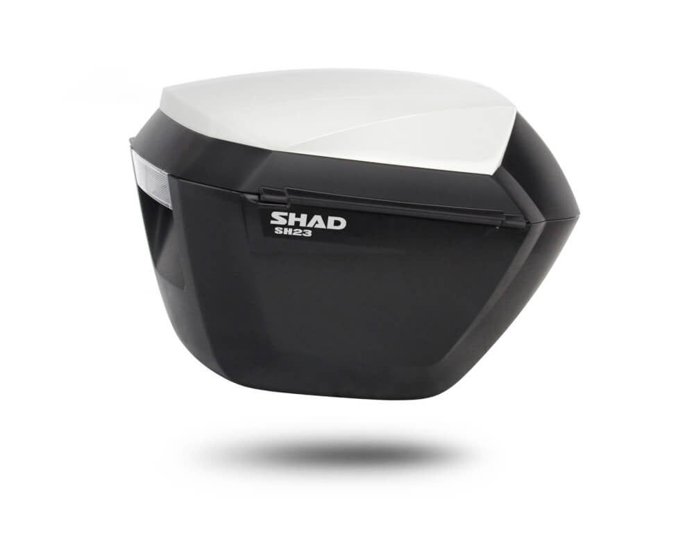 The SH23 side cases stand out for their elegance, lightness and functionality. They have great aerodynamics and keep their resistance and water tightness. The whole capacity (23 litres) is usable, and the opening on top allows the biker to reach the load without getting off the bike. It includes an extra cylinder lock as standard, in case you want to use one key to open all three cases (side and top cases). As all the SHAD motorcycle top cases, it can be open and closed with only one hand, without the need to use the key to open it. We will only use the key when we want to lock it to the motorcycle. If you are one of those that take design a step forward, you will enjoy the possibility to choose between the different cover colours available: white, new titanium, or the tintable option to customize it to your liking. The case is mounted on the motorcycle with our new system 3P SYSTEM , unique in the market. Patented by SHAD and standing out for its integrated and light design, it has been developed considering not only the look, but also giving a lot of importance to security. Integrated design: The mounting is a lot more integrated in the motorcycle. The typical rectangular frame disappears and is reduced to only one arm in the shape of a horizontal "L" that supports the three mounting points (3P) of the case, thus hiding the mounting points when the cases are extracted. Position: Both the volume of the case and the inclination of the 3P System mounting have been designed to move the whole weight as much as possible towards the motorcycle's gravity centre. This gives more security and stability when riding with load. Anchoring flexibility: The 3-point anchorage gives both security and flexibility. That is reflected in a slight oscillation of the case. That oscillation allows the air to circulate around the case, avoiding the "anchoring" effect of a more rigid and flat case. Again, that gives more security and stability when riding.