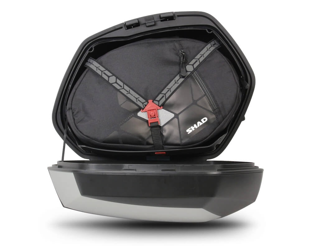 The SH35 side cases with aluminium cover are aerodynamic, rigid and light. With capacity to hold a Jet helmet or a small full-face helmet, they have higher loading capacity than most aluminium cases. They are made with 0.8mm thickness aluminium and reinforce polypropylene; its structural frame guarantees high rigidity and resistance with minimum weight, which also gives it water tightness. The SH35 are the perfect match for the eXpandible SH59X top case. Sophisticated, elegant and avant-garde, following the latest models launched by SHAD, they show SHAD's decided commitment with design: Aerodynamic design that increases the motorcycle's security and stability. Innovative shapes that create market trends. Internal tray that helps holding the load. Capacity to hold a medium size helmet. Being a bit smaller than the other side case models by SHAD, the SH36 Carbon, it cannot be guaranteed that all helmets will fit. Structural frame that offers water tightness, rigidity and lightness. It includes an extra cylinder lock as standard, in case you want to use one key to open all three cases (side and top cases). It includes holding straps to ensure that the internal load does not move. The security offered by the Handle Lock System allows to have a double lock: on the one side, it fastens the case to the bike and, on the other, it closes the top case at the same time. It has a handle to carry the case in an easy and simple way once extracted. As all the SHAD motorcycle top cases, it can be open and closed with only one hand, without the need to use the key to open it. We will only use the key when we want to lock it to the motorcycle. As a must-have accessory, there is the possibility to include internal bags (LSL-X0IB36), that fit perfectly into the side cases. They have an external pocket with zipper for direct access with gloves and they are reinforced with an internal foam to protect the contents from any hit and a zipper with puller that can be used with gloves. It also has a strap and a handle to make it easier to carry. In this way, the internal bag makes it easier to transport your belongings without having to extract the case. Together with these new and advanced cases, we have developed a new mounting system that is unique in the market: the 3P SYSTEM . Patented by SHAD and standing out for its integrated and light design, it has been developed taking into account not only the look, but also giving a lot of importance to security. Integrated design: The mounting is a lot more integrated in the motorcycle. The typical rectangular frame disappears and is reduced to only one arm in the shape of a horizontal "L" that supports the three mounting points (3P) of the case, thus hiding the mounting points when the cases are extracted. Position: Both the volume of the case and the inclination of the 3P System mounting have been designed to move the whole weight as much as possible towards the motorcycle's gravity centre. This gives more security and stability when riding with load. Anchoring flexibility: The 3-point anchorage gives both security and flexibility. That is reflected in a slight oscillation of the case. That oscillation allows the air to circulate around the case, avoiding the "anchoring" effect of a more rigid and flat case. Again, that gives more security and stability when riding.