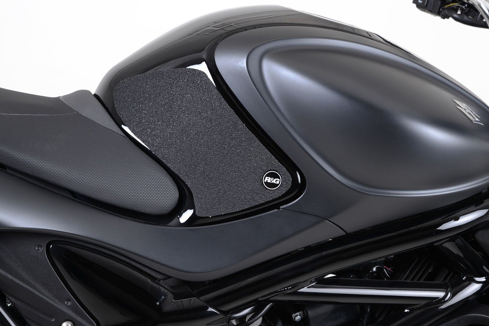 R&G Tank Traction Grip kits are available for many different bike styles and brands, with new applications released regularly. The unique R&G Traction Grip texture was specifically designed to be both soft and durable, providing the rider with the grip and feel he/she needs to assist in better bike control, enabling the rider to maintain a stable body position while cornering and braking, whilst also relieving fatigue and providing the rider with complete confidence allowing him/her to fully focus on the road (or track) ahead instead of slipping and sliding on the tank. Each Tank Traction Grip kit is supplied with precision pre-cut adhesive pieces, designed to fit the intended bike, typically in either 2, 4 or 6 pieces (in total) depending on the shape of the tank and adjoining fairing. The high-strength adhesive backing ensures a highly durable product that will stay exactly where you put it, as well as not affecting or damaging paintwork. Each R&G Tank Traction Grip kit is available in black and ultra-clear finishes to blend into your bike’s paintwork or stand out, depending on your preference. R&G Tank Traction Grips work in both wet and dry conditions and is equally at home on the track as it is on the commute home!Please note: R&G Tank Traction Grips now come with a 25mm diameter stick on emblem.This 2pcs Tank Traction Grip has been specially designed for the Suzuki SFV Gladius 650 '09- models. Made in the UK.