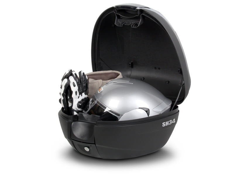 The SH34 is a compact and practical top case, made with high-quality reinforced polypropylene and with capacity to hold a modular helmet and gloves. It includes the carbon look cover as standard equipment which gives it a multipurpose, aggressive and aerodynamic look, both urban and agile. It is designed for those who look for the highest level of sophistication and style: it's sporty, elegant and practical. The internal volume has been optimized and achieves the maximum use of space, with a real 34-litre capacity. With no pins between the hinges and a semi-circular curve in the back of the case, it offers more comfort and ergonomics for the second passenger. It has been carefully designed to create a compact top case, with real capacity and big within its category. It has the Press Lock System, a simple and hermetic pressure lock system. As all the SHAD motorcycle top cases, it can be open and closed with only one hand, without the need to use the key to open it. We will only use the key when we want to lock it to the motorcycle. It has a slit that takes the role of ergonomic handle to make it easier to carry. If you are one of those that take design a step forward, you will enjoy the possibility to choose between the different cover colours available; or the tintable option for you to customize it to your own taste. As optional accessories, we offer the backrest and braking light. The backrest (LSA-D0RI40) offers more comfort for the passenger, as well as giving a unique style to the whole bike. The braking light (LSA-D0B29KL) is made with energy-saving leds and is very easy to install, as it fits in the lower part of the top case s base. This increases security, as the bike is more visible from behind. As the rest of the SHAD motorcycle top cases (except for TR48/TR37), it includes the plate and the screws kit.