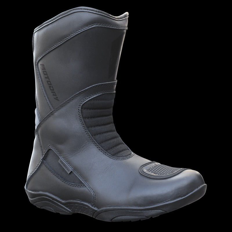 High quality Top Grain Leather, double-stitched outer construction Padded / reinforced shin protection, plus lined inner ankle cup , TPU shift pad & safety reflective Touring Fit Stretch panels front & rear for comfort & zip/velcro flap closure, plus TPU shift pad Hipora - 100% Waterproof & Breathable membrane with vented lining Oil resistant/non-slip rubber sole for grip & pre-formed orthopedic / anti-vibration foot bed for comfort