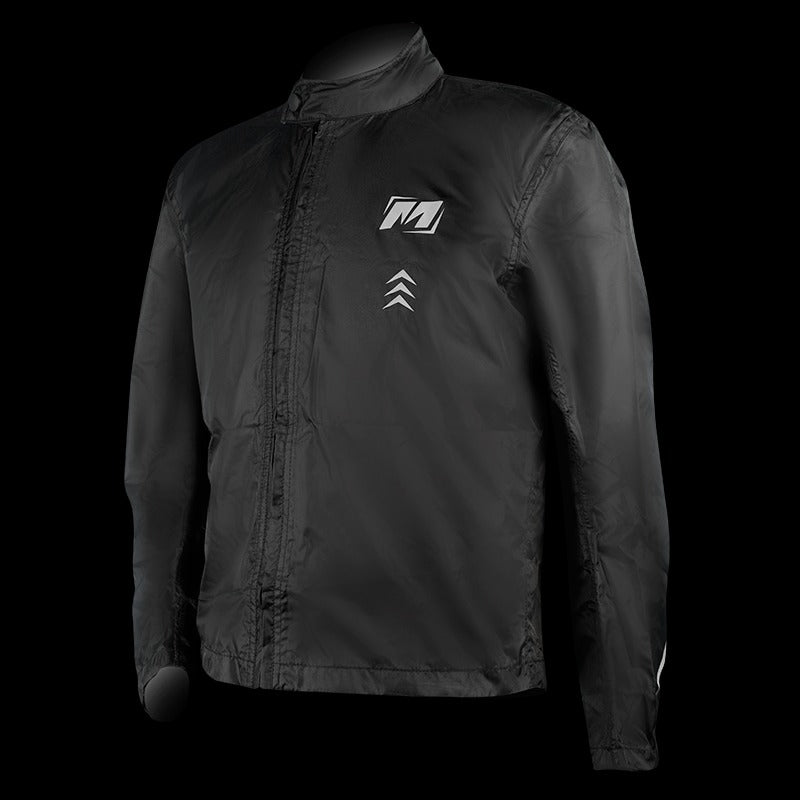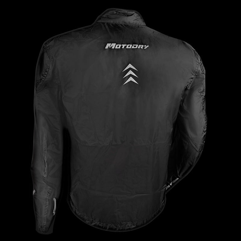 (RAINWEAR) - Durable Nylon/PU backed rain jacket - Double row stitched seams - Taped seams for 100% waterproofing - Designed to fit perfectly over Motodry Ultra-Vent / Summer-Vent jacket - Zip closure, and snap collar - Night safety reflective print - Medium waist length