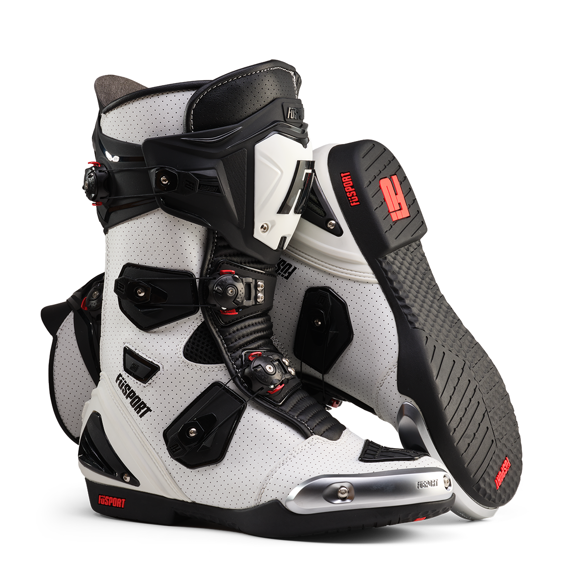 The all NEW XR1 or Xtreme Rennen Motorcycle boots are the top-of-the-line, CE Safety Approved race boot from Füsport. Currently on the feet of world champions, these motorcycle boots not only cater to the ranks of track day riders. But extend their prowess to meet demands of the highest levels of competition. Meticulously crafted and rigorously tested with a keen focus on top-tier racing. The design reflects a commitment to elevating both safety and comfort. Each decision in the design process is a stride towards enhancing the rider’s experience, allowing the riders peace of mind as they navigate the twists and turns of the Racetrack. These boots stand as a testament to the pursuit of excellence. Ensuring that those who wear them not only feel the part but also perform at the top of their capabilities on the race track. The new F.I.A.S (Füsport Internal Articulation System) allows the rider great feel without skimping on protection. This articulated ankle protection has been 5 years in the making, with each passing year dedicated to analyzing feedback, refining materials, and enhancing the protective capabilities of the ankle support. The XR1 features a new Füsport Rotor Closure system (F.R.C.S) with ratchet closure fasters across three points that tightens the boot around the calf, ankle and forefoot. This along with the F.I.A.S makes it one of the safest boots on the market. Equipped with a Tri-Compound sole, the three zones of grip maximize control on the bike and longevity in the pits, being resistant to Water, Oil and Petrol. To top it off, all removable parts on the XR1 are replaceable to increase the life of the XR1 boots. Sizes: 39 EU – 48 EU Colours: Stealth (All Black) Black/Dark Grey/Fluro White/Black/White Grey/Black/White