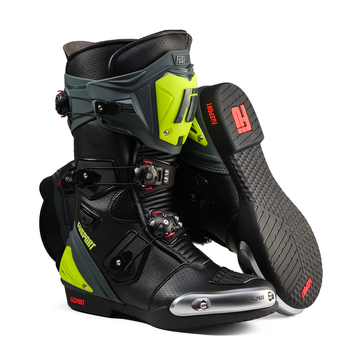 CE Certified F.I.A.S articulation system Tri Compound Racing sole resistant to water, oil & petrol Velcro panel for precise fit Füsport Rotor Closure system (F.R.C.S) ratcheting closure/tensioning system Perforated PU Microfibre construction to allow riders to stay cool TPU heel protection TPU shin protection Air mesh lining Heel ventilation to keep your feet cool Replaceable toe sliders (sold separately) Replaceable closure system (sold separately) Interchangeable shin and heel TPU so you can customise your colourway (sold separately)